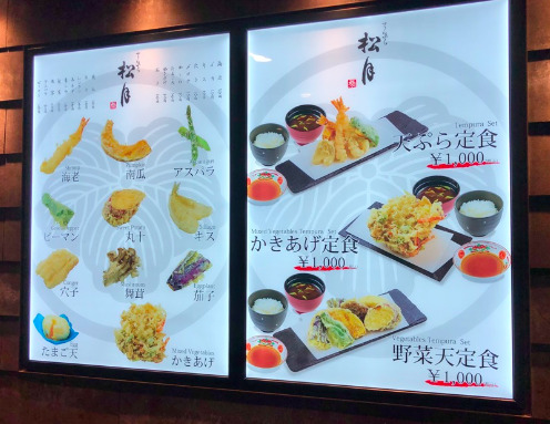 天ぷら定食、野菜天定食、天丼、かき揚げ丼などがあります。