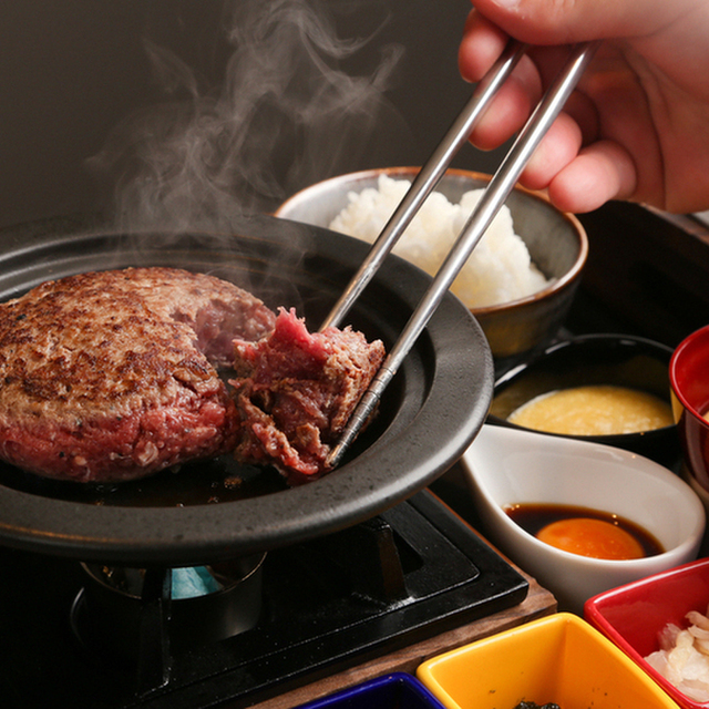 当日ひきたてミンチ、つなぎを一切使用しない和牛100%のレアハンバーグ。